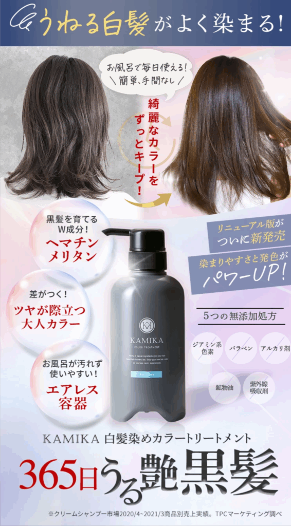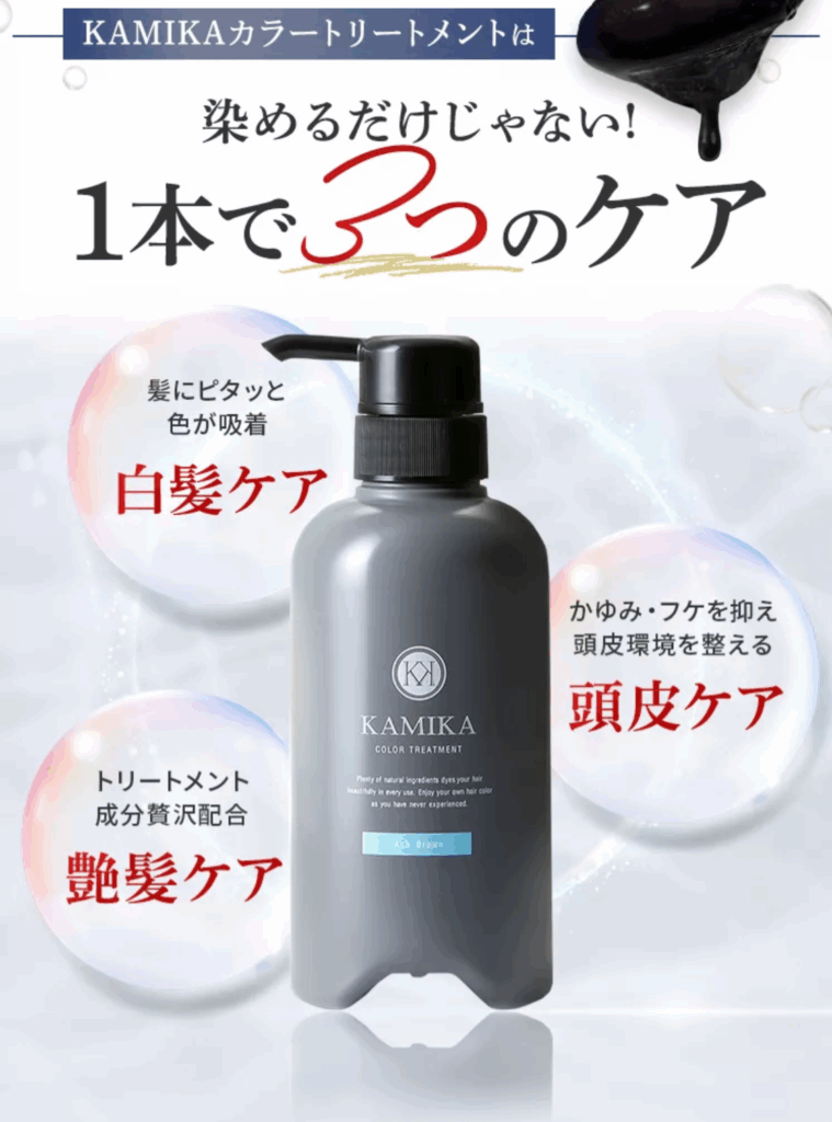 【PR】KAMIKA 待望の新商品カラートリートメントのご紹介です。★うねる白髪がよく染まる!傷んだ髪ほどよく染まり。白髪と強く結合する「イオンカラー」を採用。髪にダメージを与えることなく、綺麗な発色を実現するとの事です。★白髪ケア成分をW配合ダメージを補修してくれる「ヘマチン」「メリタン」配合。キューティクルをきゅっと締めるので色モチもUPするとの事です。特に、白髪予防として近年大注目されている成分「メリタン」配合のカラートリートメントは希少だそうです。★使えば使うほど髪がツヤツヤに!海の恵み成分、フルーツ幹細胞エキス、蜂蜜、トリートメント成分をたっぷり配合。さらに、γ-ドコサラクトンの効果で、ドライヤーをかける度にツヤ髪へと導くとの事です。★ツヤが際立つ大人カラー!アッシュブラウンとローズブラウンの2色展開。ベッタリとした黒ではなく、ツヤや立体感が出るカラーに拘ったそうです。★洗練されたフローラルフルーティの香り白髪染めのツーンとした嫌な匂いはカットし、カラートリートメント中もヘッドスパをしているような心地よい時間をお過ごしいただけるとの事です。★汚れにくく、使いやすいボトル浴室で汚れにくく使いやすいボトルタイプです。ポンプ式のエアレス容器を採用してるので、最後まで余すことなく使い切ることが出来るそうです。★5つのフリー処方だから毎日使えるジアミン系色素、パラベン、アルカリ剤、鉱物油、紫外線吸収剤は不使用。毎日使っていただけるよう髪と頭皮に優しい商品だそうです。白髪が気になっている方・白髪を染めたいが、白髪染めに抵抗がある方・現在白髪染めをしているが、髪や頭皮のダメージが気になる・白髪染めは面倒くさいと感じている方におすすめです。※効果には個人差がございます。 詳細はこちらをクリック カラートリートメント 初回2,470円(税込) ■髪を傷めず、白髪を染める半永久染毛料■自宅で毎日使える白髪ケア■ピタッと色が吸着!うねり白髪がしっかり染まる■差がつく!ワンランク上の立体カラー■お風呂が汚れず使いやすい!エアレス容器■ずっと続く美しい黒艶髪へ※効果には個人差がございます。 おすすめ情報 商材名 KAMIKA運営者 A.R※当サイトはアフィリエイトプログラムを利用し宣伝目的で作成しております。
