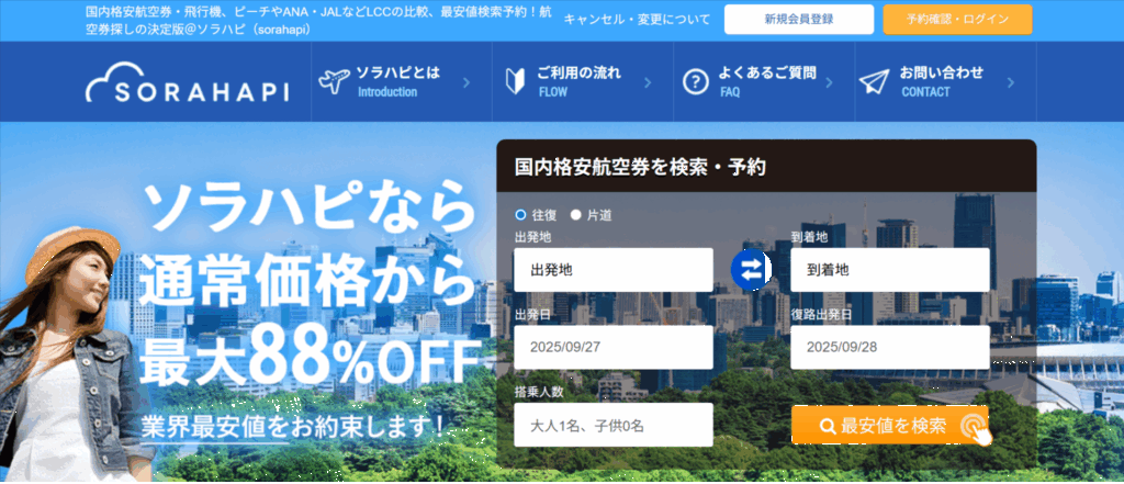 【PR】ソラハピ 航空券予約サイトのご紹介です。航空券は、同じ日・同じ路線でも予約方法によって料金が異なります。また毎日更新されますので、最新の航空券がGETできます。カンタン操作!5分でチケット購入完了「出発地、到着地、出発日」の3項目を入力するだけで、カンタンに航空券が比較・検索できます。ご希望の料金・時間帯の航空券に空席が見つかれば、そのまま購入手続きへ。5分でご希望の航空券が見つかります。・お得な航空券を探している旅行予定者・飛行機を利用することが多いビジネスマン・急用で飛行機を利用することになった方におすすめです。「航空券」を比較・検索・予約ができるサービスです。主要航空会社10社の中から、お客さまが希望される料金や時間にピッタリの航空券をカンタンに5分でご予約いただけます。もちろんLCCも取り扱っています。「とにかく安く航空券を買いたい」や「これから急に飛行機に乗らなければならなくなった」などのお客様のニーズに幅広くお応えしています。 詳細はこちらをクリック おすすめ商品 福岡発東京(羽田)行き 8,960円(税込)~ フライト時間:1時間35分始発便の時間:07:00 – 08:35最終便の時間:21:20 – 23:00便数:58便 福岡発沖縄(那覇)行き 5,650円(税込)~ フライト時間:1時間45分始発便の時間:07:05 – 08:50最終便の時間:20:50 – 22:35便数:41便 おすすめ情報 商材名 ソラハピ運営者 A.R※当サイトはアフィリエイトプログラムを利用し宣伝目的で作成しております。