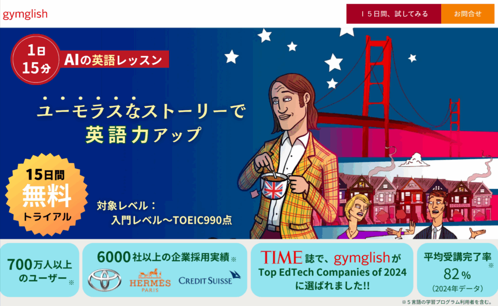 【PR】gymglish(英語) おすすめのAIによるユーモラスな英語レッスンのご紹介です。■こんな方におすすめ・効率的に学習したいけど、どう取り組めば良いか分からない・興味を持てる語学教材がなかなかない・会話教室に行っても、話すのが恥ずかしいこちらのAIによる語学レッスンは、・脳科学や第二言語習得論の知見から設計したプログラム。楽しく続けられて、学習成果を出してくれます。・AIによるレベル調整機能で無駄なくレベルアップ!あなただけの最適な学習内容をAIが統計データから毎回構成してくれます。・AIとの会話機能で、好きな時に手軽に会話レッスン 発話機会を増やし、英語の文を構築して話す脳の回路を作るとの事です。・1日15分の短いレッスンだから続けやすい 海外でも出席率80%の実績! 挫折せずに長く継続できる!だから成果を出す事ができるそうです!・多読多聴を重視した毎日のレッスンで理解スピードがアップ!自然とネイティブの会話も理解できるようになるそうです。・楽しい学びは記憶に定着!ユーモラスなレッスンで文法や語彙が記憶に残る!本気でコンテンツを開発。楽しい学びは記憶に定着するという脳科学の知見から設計されました。・AIが最適なタイミングで、文法や単語の復習の機会を作るので、覚えられる!AIが学習進捗と忘却曲線を意識したタイミングで、復習の機会を提供してくれます。レッスンを楽しく続けられて、成果を出します。しかも、ユーザー個別のレッスンなのに、AIが毎回構成するため、月数千円で受講いただけるとの事です。15日間の無料トライアルでお試しいただけます!受講料(月額・税込) 6ヶ月6,136円12ヶ月4,563円24ヶ月3,776円36ヶ月2,990円 詳細はこちらをクリック おすすめ商品 AIによるレベル調整機能で効率的に英語を習得 AIがレッスンでの回答内容を、過去の多くの回答データから統計的に分析し、語学レベルを特定した上で、受講者毎に合ったレッスンを構成してくれます。効率的なので、1日15分でも十分効果が期待できます。 楽しいレッスンで、文法や単語が記憶に定着 漫画を読むように楽しめます。楽しい学びは記憶に定着するという脳科学の知見から設計しました。 おすすめ情報 商材名 gymglish(英語)運営者 A.R※当サイトはアフィリエイトプログラムを利用し宣伝目的で作成しております。